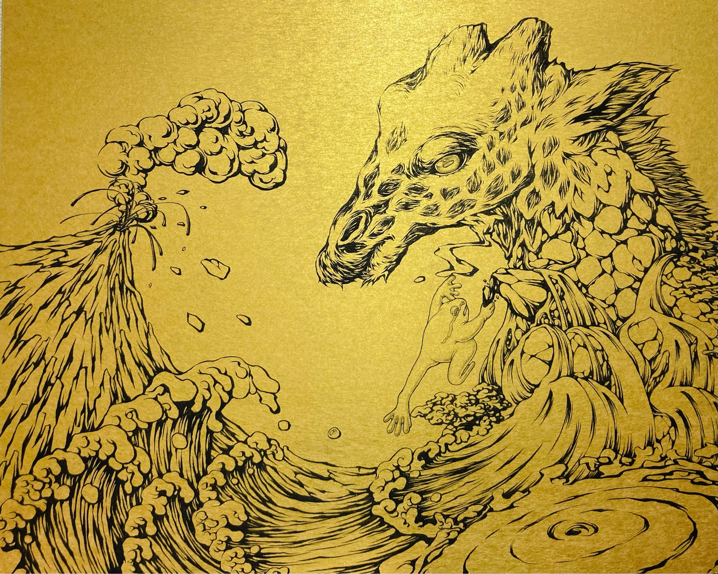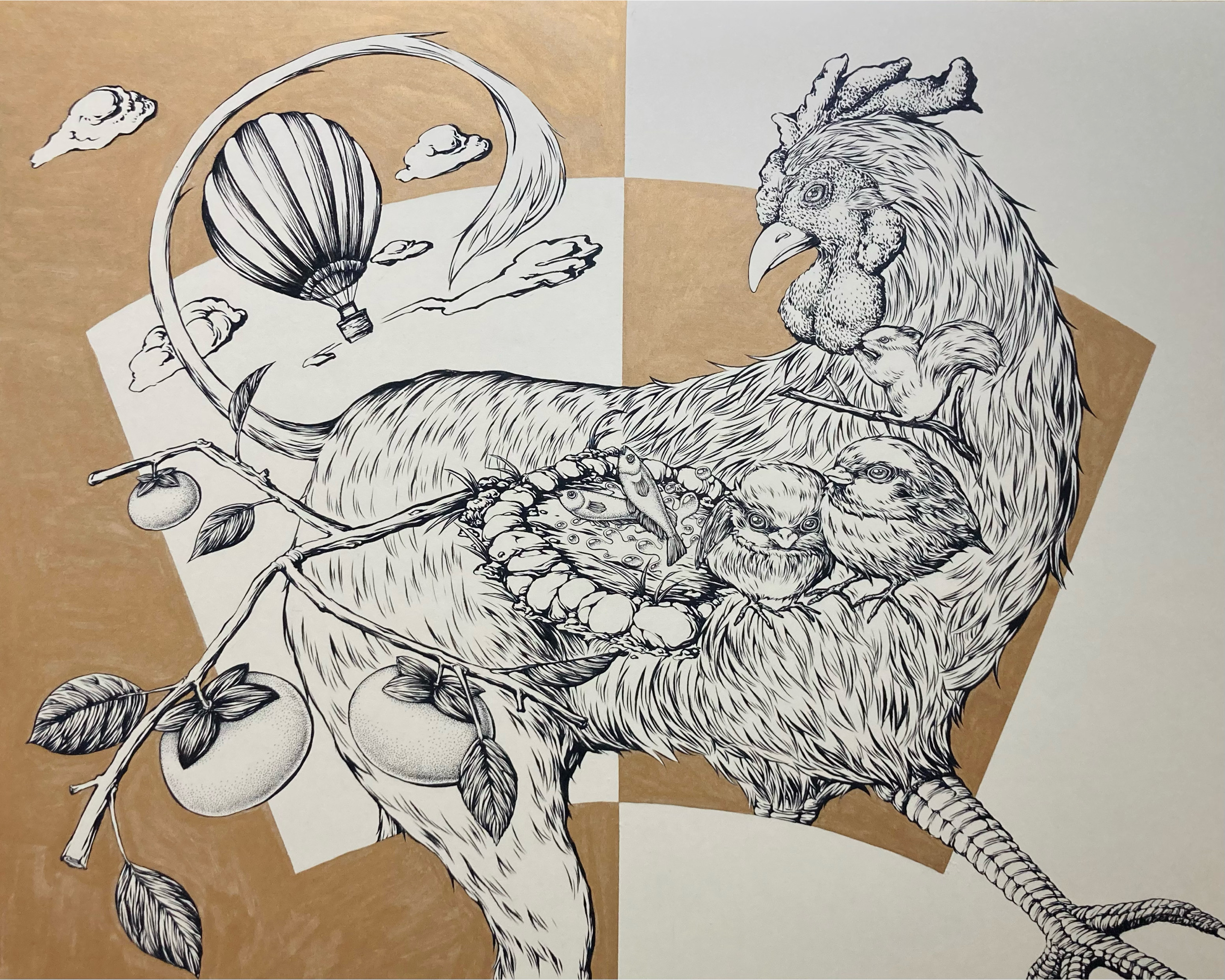 どちらも芸術祭テーマのうち「岐点」を意識しており、前者は画面の真ん中を境にニワトリの上半身(?)が牛の下半身(?)に切り替わる構成とし、後者は温厚なものが「逆鱗」に触れられた途端に豹変する様子を、天変地異に見立てて描きました。