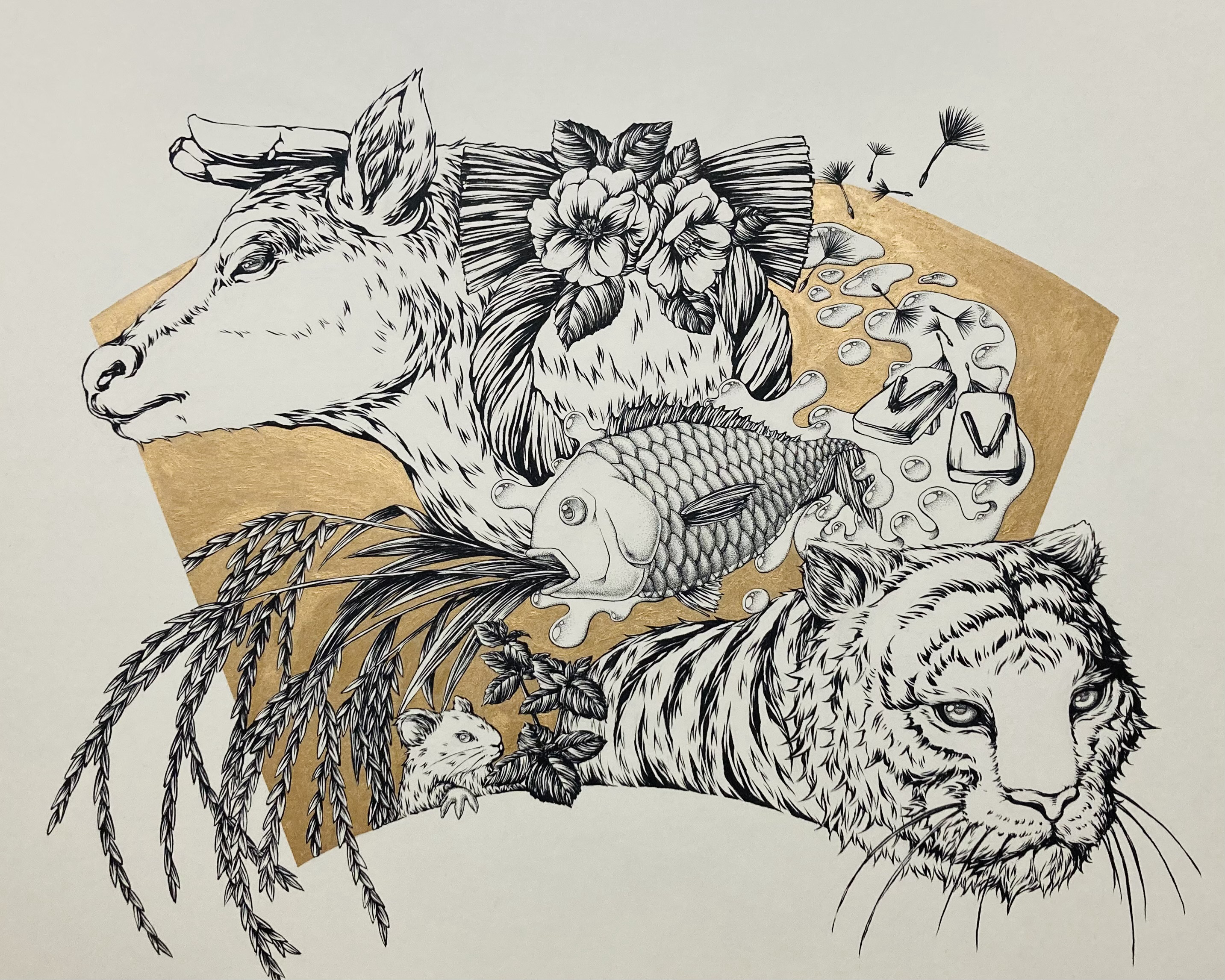 モチーフとしては動植物をよく選びます。それに絵しりとりや隠し絵、言葉遊びといったテーマを取り入れた「格好良さの中にちょっとしたユーモアのある作品」を主に制作し、ギャラリーでの展示やアートイベントなどで活動しております。